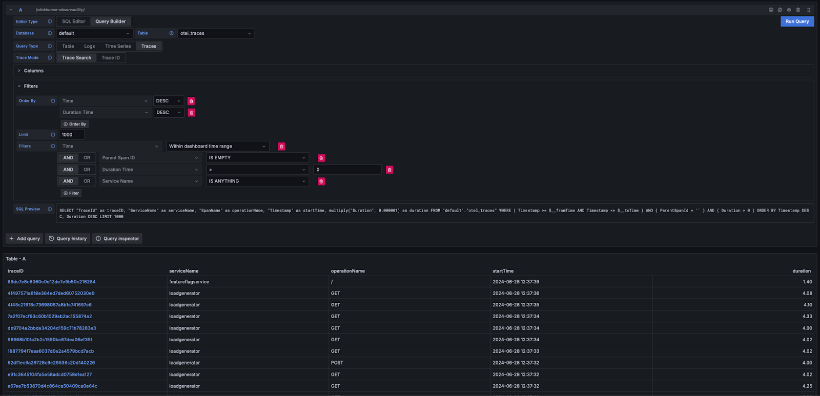 Similar to the above logging experience, if the columns required by Grafana to render traces are satisfied (e.g., by using the OTel schema), the query builder is able to automatically formulate the necessary queries. By selecting Query Type: Traces and clicking Run Query, a query similar to the following will be generated and executed (depending on your configured columns - the following assumes the use of OTel):